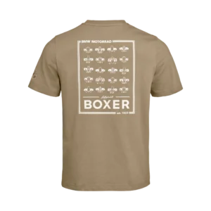 Prix spécial web ! T-shirt à col rond coupe droite, style Heritage Grand motif moteur Boxer imprimé dans le dos Inscription "Aircooled" et logo BMW Motorrad sur la poitrine Coton biologique 100% jersey simple doux et résistant Coloris Kaki au style vintage et motard affirmé