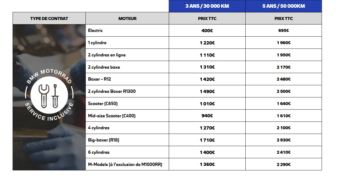 Les tarifs des contrats BMW Motorrad Service Inclusive varient en fonction du type de moteur de votre véhicule BMW Motorrad et de la durée ou du kilométrage choisi. Voici un aperçu des prix pour différents modèles et options :